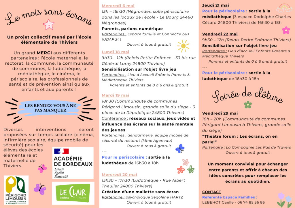 Un projet collectif à l’Initiative de l’école élémentaire de Thiviers avec la participation de différents partenaires : l’école maternelle, le rectorat, la commune, le Pôle Culture Enfance Jeunesse de la Communauté de communes (le périscolaire, la ludothèque, la médiathèque…), le cinéma et les professionnels de santé et de prévention.