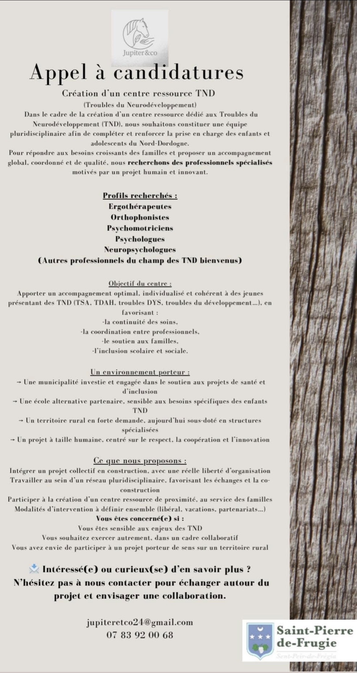 - Créer un centre de médiation équine et un centre ressource dédié aux troubles du neurodéveloppement à Saint-Pierre-de-Frugie.